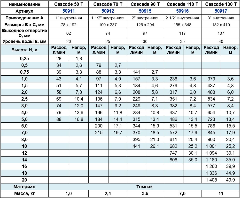 Водные формы, создаваемые насадками серии Cascade T, заметно оживят любое пространство и добавят динамики в водную композицию. В зависимости от уровня воды струя может быть тонкой и высокой либо более объемной и низкой. При этом чтобы достигнуть такого эффекта, необязательно использовать насосы большой мощности.